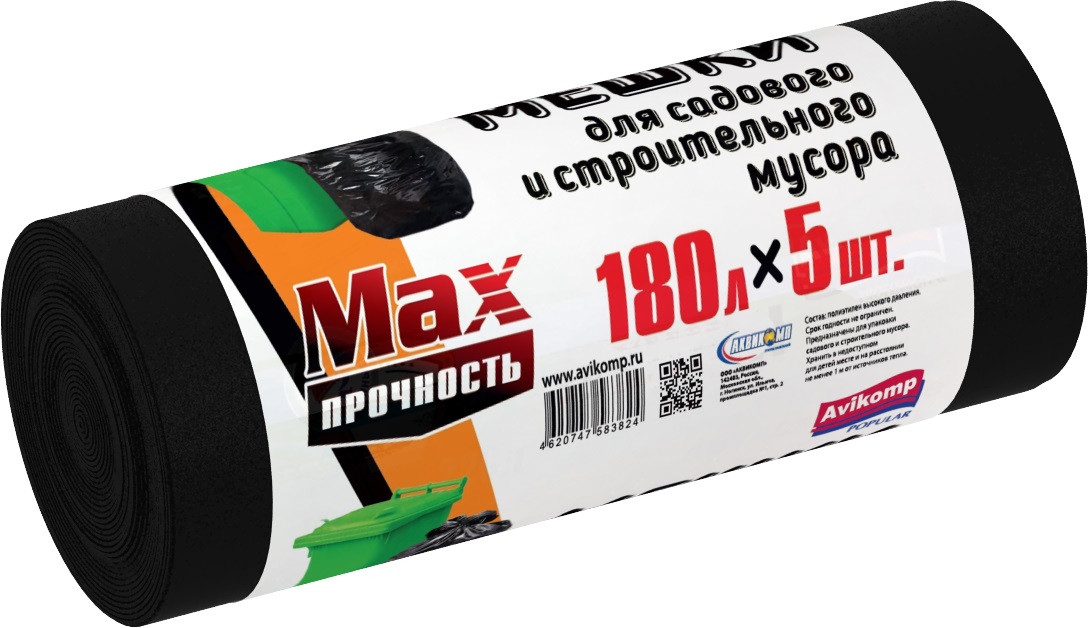 Пакеты для мусора 180л 5шт 35мкм рулон ПВД черный Avikomp МаксПрочность (15)