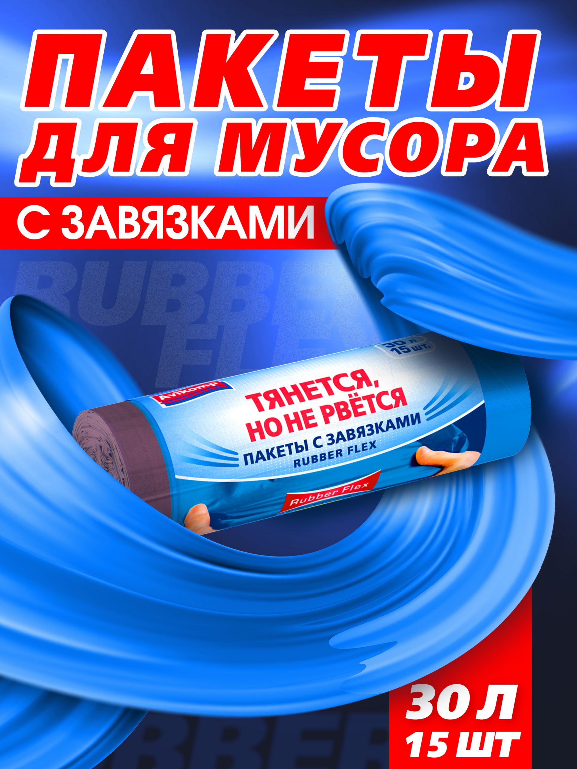 Пакеты для мусора 30л 15шт 20мкм завязки рулон ПВД голубой Rubber Flex Avikomp (20)