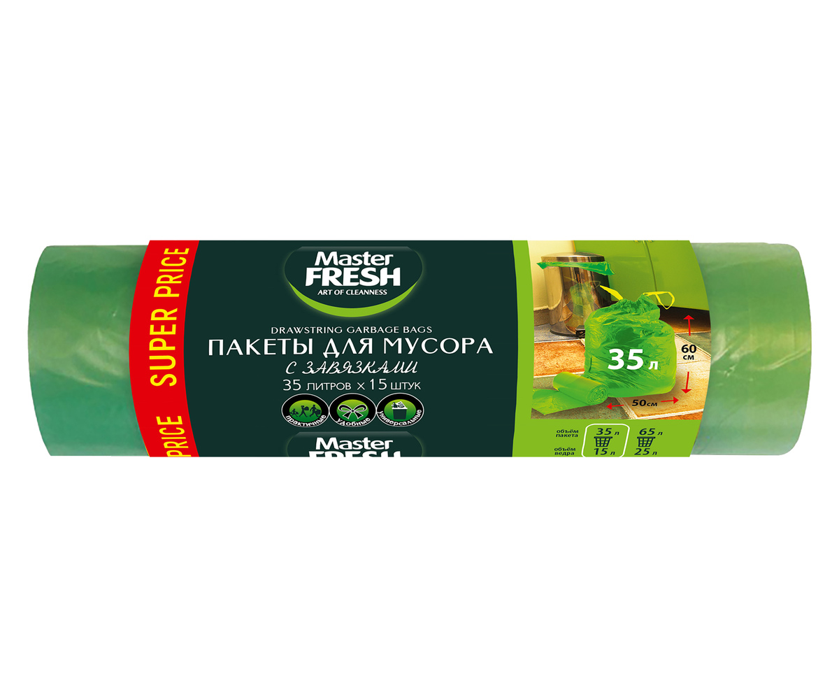Пакеты для мусора 35л 15шт 14мкм завязки рулон ПНД зеленый Master FRESH (25) акция
