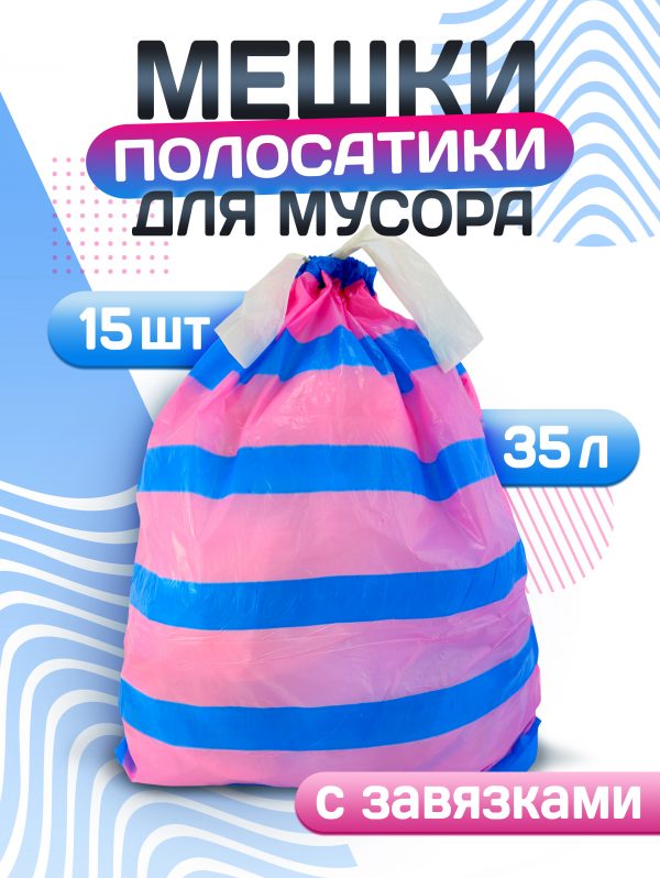 Пакеты для мусора 35л 15шт 20мкм завязки рулон ПСД голубой/розовый Avikomp Полосатики (20)