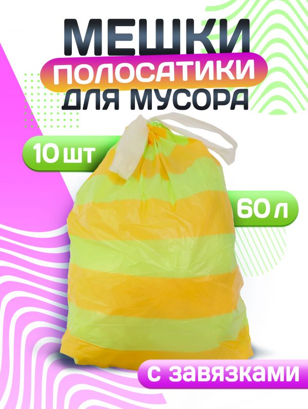 Пакеты для мусора 60л 10шт 22мкм завязки рулон ПСД желтый/салатовый Avikomp Полосатики (20) акция
