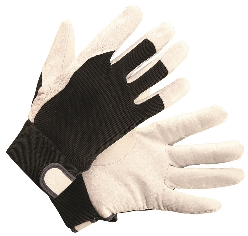 Перчатки из натуральной козьей кожи на рабочей поверхности ладони и кончиках пальцев и высококачественного воздухопроницаемого трикотажа на тыльной стороне. Прочная мягкая кожа гарантирует свободу движений, высокую чувствительность пальцев. Удобная фиксация на запястье с помощью застежки – липучки.