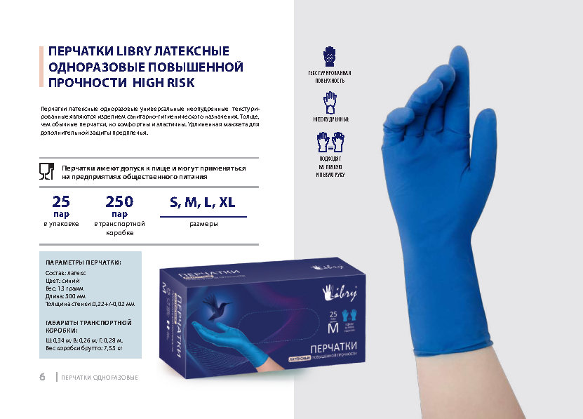 Перчатки смотровые нестерильные повышенной прочности используются для клинико-диагностических процедур, в условиях, требующих повышенной защиты. Изделия изготовлены из натурального латекса, поверхность обработана с помощью однократной хлоринации. Данный тип обработки позволяет легко надеть перчатку на руку и снизит риск контактного дерматита. Полностью текстурированная поверхность обеспечит надежный захват инструментов. Прочностные характеристики и удлиненная манжета обеспечивают надежную защиту от воздействия химически агрессивных сред и устойчивость к механическим повреждениям. Перчатки имеют универсальную форму, а манжета закатана в валик. Широкая конструкция манжеты предотвращает сдавливание запястья, таким образом снижая утомляемость рук во время длительных процедур.
