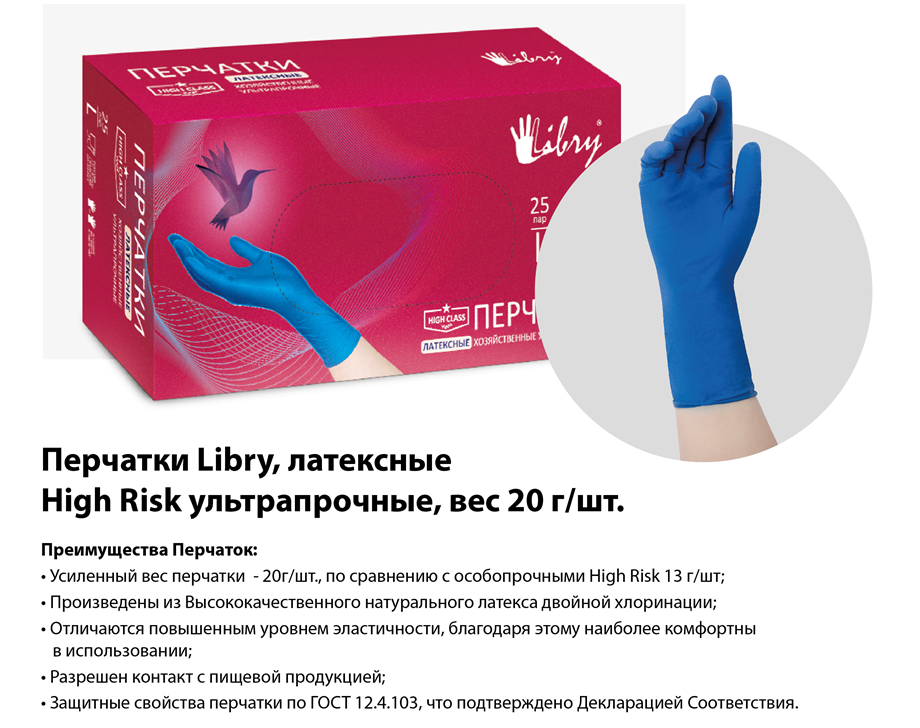 Перчатки латекс ультрапрочные M 50шт 20гр синий Libry (10)