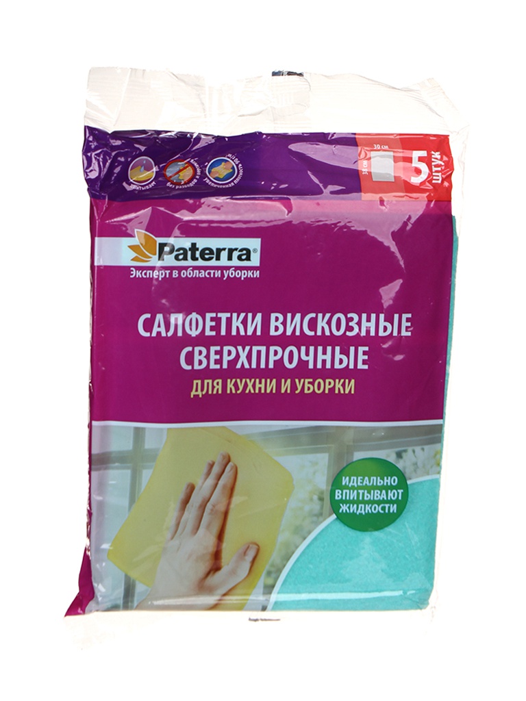 Благодаря повышенной плотности (90 гр/м), вискозные салфетки PATERRA служат в 2-2,5 раза дольше, чем более тонкие аналоги. Салфетки не рвутся, их можно неоднократно стирать. Салфетки имеют в составе максимальный процент вискозы (70%), что обеспечивает идеальную впитываемость. Салфетки не оставляют ворсинок, т.к. содержат 30% полиэстера, отвечающего за гладкость и мягкость. Для очистки жирных загрязнений вместе с салфетками рекомендуется применять бытовую химию. Салфетки имеют увеличенный по сравнению с аналогами размер. 3 цвета в ассортименте