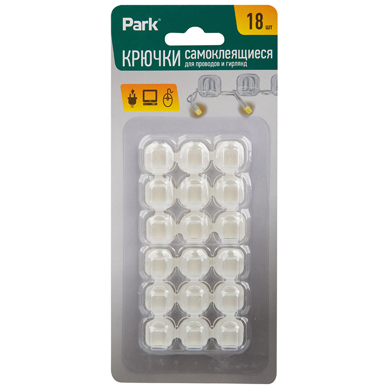 Крючки на самоклеящейся основе 1,5x1,5см 18шт пластик Park нагрузка 0,5кг, для гирлянд и проводов (12/240)