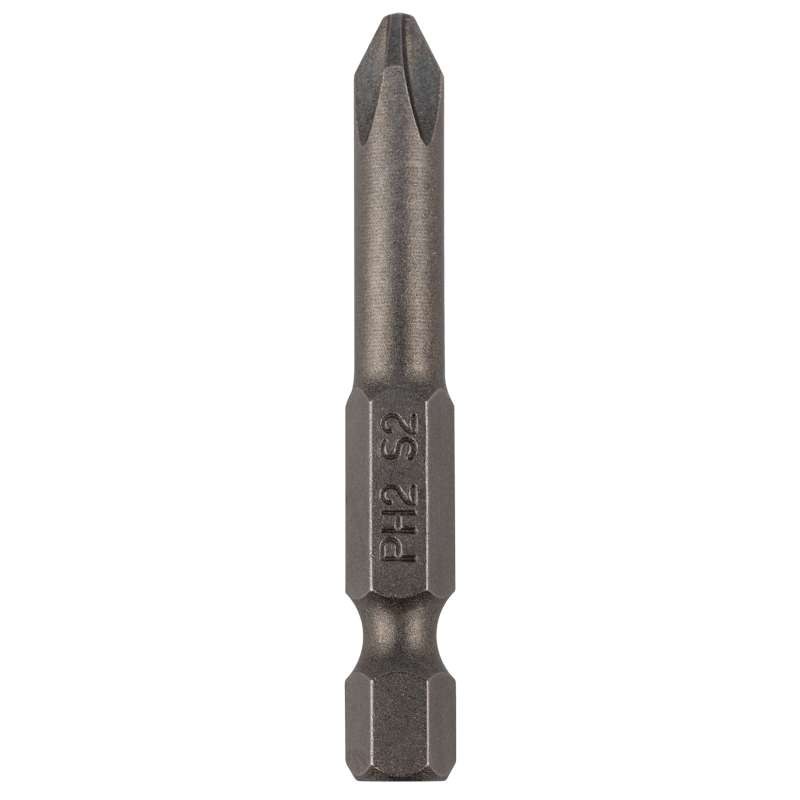 Бита PH2х50 мм (насадка) для закручивания крепежа (шурупы, винты). Произведена из стали S2 и закалена до оптимальной твердости, чем обусловлен высокий ресурс. Шестигранный хвостовик (Е6,3) обеспечивает быструю и надежную фиксацию в шуруповертах. Также используется с отверткой для бит.