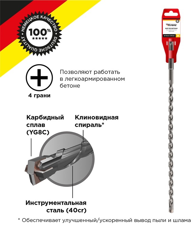 Бур по бетону с крестообразным наконечником 10x310 мм KRANZ используется во время строительных и ремонтных работ. Предназначен для сверления и бурения отверстий в слабоармированном бетоне, граните, кирпичной кладке и камне при помощи перфоратора с креплением SDS PLUS, которое используется в большинстве электроинструментов бытового и профессионального назначения. Изделие выполнено из качественной стали, что обеспечивает долгий ресурс работы и высокую производительность. Конструкция со стабилизирующей спиралью сохраняет точное положение бура во время сверления и равномерно распределяет ударную нагрузку, кромки с 4 гранями обеспечивают легкое выведение шлама и мелких частиц пыли из рабочей зоны, что поддерживает скорость работы, а усиленный резец предотвращает заклинивание оснастки в арматуре. Твердосплавная вставка на конце бура способствует эффективному входу в материал, что увеличивает цикл службы оснастки и уменьшает износ сверла.