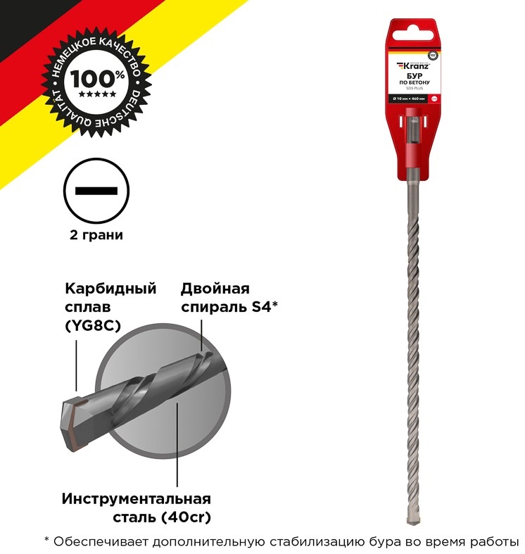 Бур по бетону с цилиндрическим хвостовиком 10x340 мм KRANZ используется во время строительных и ремонтных работ. Предназначен для сверления и бурения отверстий в слабоармированном бетоне, граните, кирпичной кладке и камне при помощи перфоратора с креплением SDS PLUS, которое используется в большинстве электроинструментов бытового и профессионального назначения. Изделие выполнено из качественной стали, что обеспечивает долгий ресурс работы и высокую производительность. Конструкция со стабилизирующей спиралью сохраняет точное положение бура во время сверления и равномерно распределяет ударную нагрузку, кромки с 2 гранями обеспечивают легкое выведение шлама и мелких частиц пыли из рабочей зоны, что поддерживает скорость работы, а усиленный резец предотвращает заклинивание оснастки в арматуре. Твердосплавная вставка на конце бура способствует эффективному входу в материал, что увеличивает цикл службы оснастки и уменьшает износ сверла.