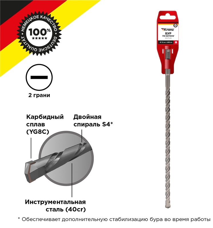 Бур по бетону с цилиндрическим хвостовиком 12x600 мм KRANZ используется во время строительных и ремонтных работ. Предназначен для сверления и бурения отверстий в слабоармированном бетоне, граните, кирпичной кладке и камне при помощи перфоратора с креплением SDS PLUS, которое используется в большинстве электроинструментов бытового и профессионального назначения. Изделие выполнено из качественной стали, что обеспечивает долгий ресурс работы и высокую производительность. Конструкция со стабилизирующей спиралью сохраняет точное положение бура во время сверления и равномерно распределяет ударную нагрузку, кромки с 2 гранями обеспечивают легкое выведение шлама и мелких частиц пыли из рабочей зоны, что поддерживает скорость работы, а усиленный резец предотвращает заклинивание оснастки в арматуре. Твердосплавная вставка на конце бура способствует эффективному входу в материал, что увеличивает цикл службы оснастки и уменьшает износ сверла.