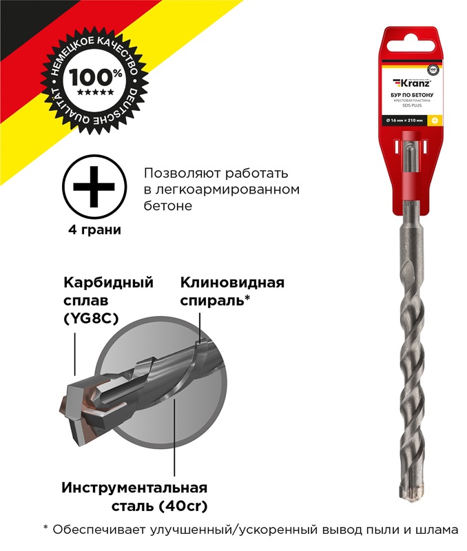 Бур по бетону 16х210мм SDS-plus крестовая пластина Kranz (120)