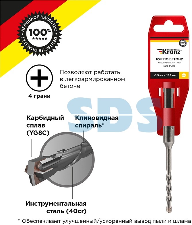 Бур по бетону с крестообразным наконечником 5x110 мм KRANZ используется во время строительных и ремонтных работ. Предназначен для сверления и бурения отверстий в слабоармированном бетоне, граните, кирпичной кладке и камне при помощи перфоратора с креплением SDS PLUS, которое используется в большинстве электроинструментов бытового и профессионального назначения. Изделие выполнено из качественной стали, что обеспечивает долгий ресурс работы и высокую производительность. Конструкция со стабилизирующей спиралью сохраняет точное положение бура во время сверления и равномерно распределяет ударную нагрузку, кромки с 4 гранями обеспечивают легкое выведение шлама и мелких частиц пыли из рабочей зоны, что поддерживает скорость работы, а усиленный резец предотвращает заклинивание оснастки в арматуре. Твердосплавная вставка на конце бура способствует эффективному входу в материал, что увеличивает цикл службы оснастки и уменьшает износ сверла.