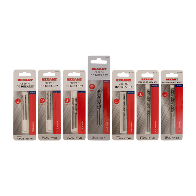 Набор сверл по металлу Слесарь Standart (P6M5) диаметр 2-2,5-3-3,5-4-5-6 мм (7 шт.) REXANT. Произведено по стандарту DIN338, из быстрорежущей стали М2 (аналог P6M5), твердостью 63 HRC.