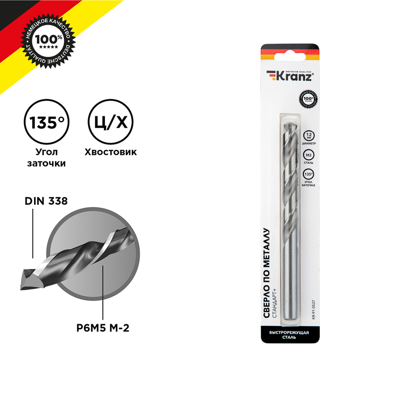 Сверло по металлу 12.0мм 12х151х101мм Kranz Стандарт+ (5)