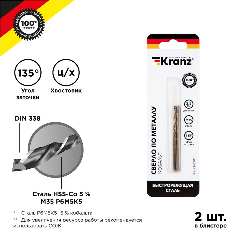 Сверло по металлу 2.5мм HSS-Co DIN338 2шт Kranz «Кобальт» (500)