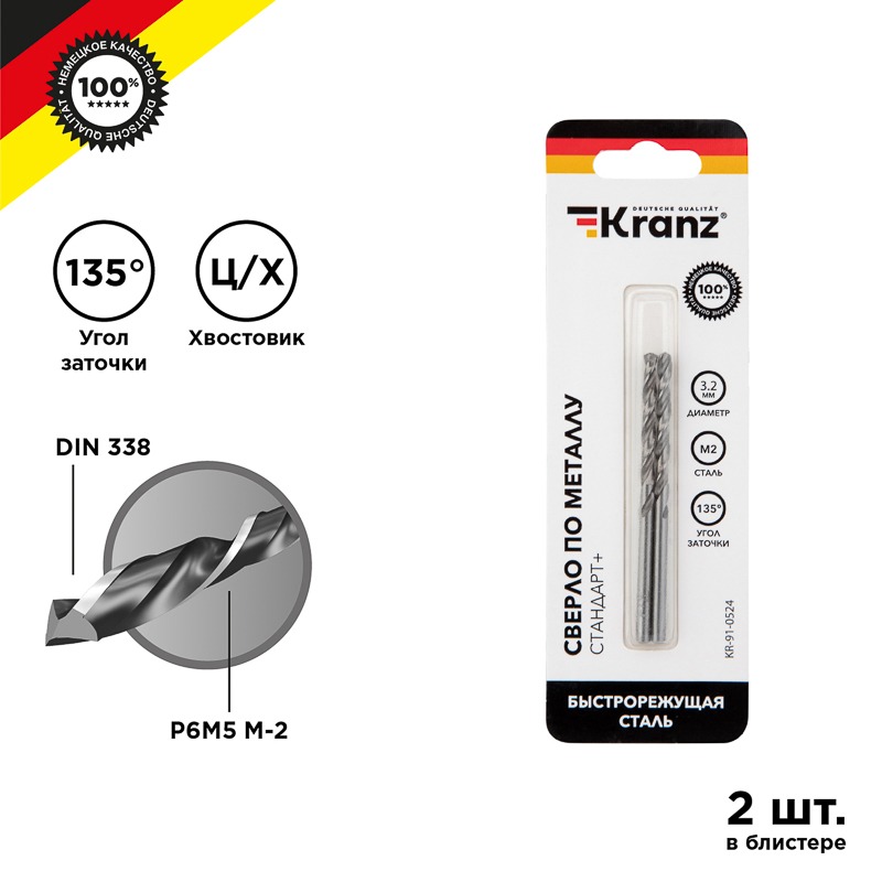 Сверло по металлу 3.2мм P6M5 DIN338 2шт Kranz «Стандарт+» (500)