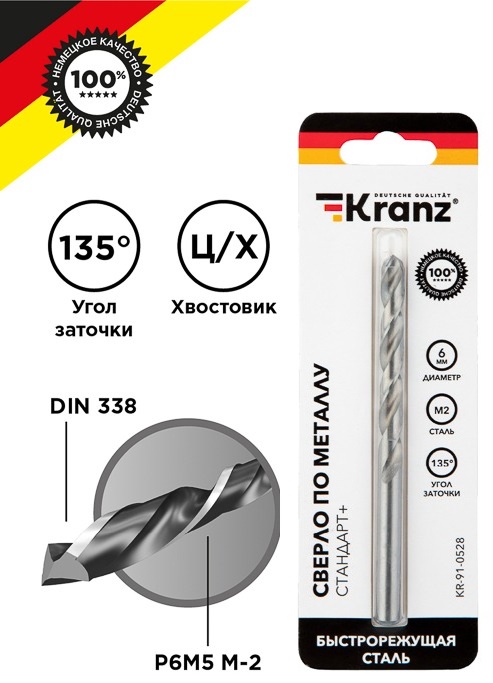 Сверло по металлу 6мм P6M5 M-2 Kranz «Стандарт+» (400)