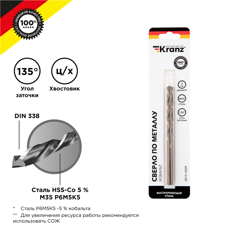 Сверло по металлу 7мм HSS-Co DIN338 Kranz "Кобальт" (400)