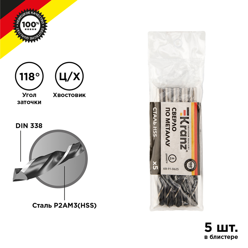 Сверло по металлу 8,0 мм HSS (5 шт. в упаковке) DIN 338 Kranz