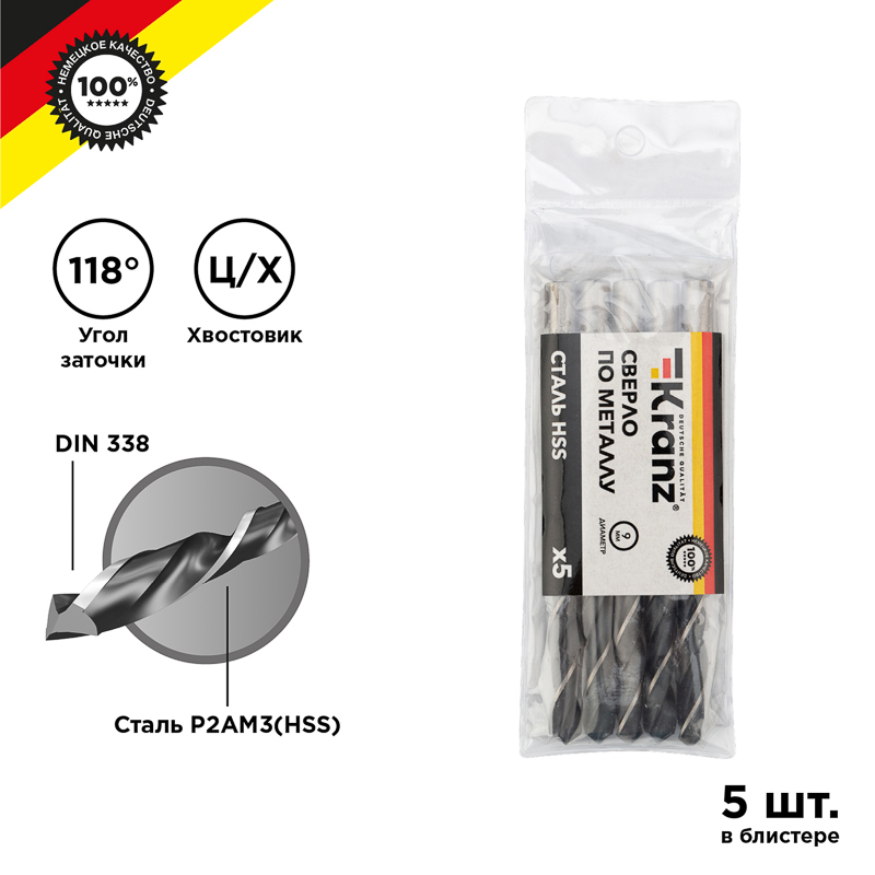 Сверло KRANZ соответствует стандартам профессиональной оснастки. Предназначено для сверления отверстий в мягких и средних по твердости металлах, пластике и различных породах дерева при помощи дрели или станка с цилиндрическим креплением, которое используется в большинстве электроинструментов бытового и профессионального назначения. Изделие выполнено из качественной инструментальной стали, что обеспечивает долгий ресурс работы и высокую производительность. Конструкция со стабилизирующей спиралью сохраняет точное положение оснастки во время сверления, что гарантирует ровные и аккуратные отверстия без трещин и сколов. Заточка режущей части под углом 118 градусов способствует эффективному входу в материал, что увеличивает цикл службы оснастки и уменьшает износ бура. Диаметр хвостовика соответствует диаметру сверления.