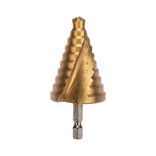 Ступенчатое сверло предназначено для получения отверстий различного диаметра без перестановки режущего инструмента. Применяется в работе с такими материалами, как пластик, дерево, металл и др. Хвостовик прибора имеет форму конуса. На каждой ступени есть маркировка фактического диаметра. Сверло изготовлено из инструментальной легированной стали и покрыто нитридом титана.