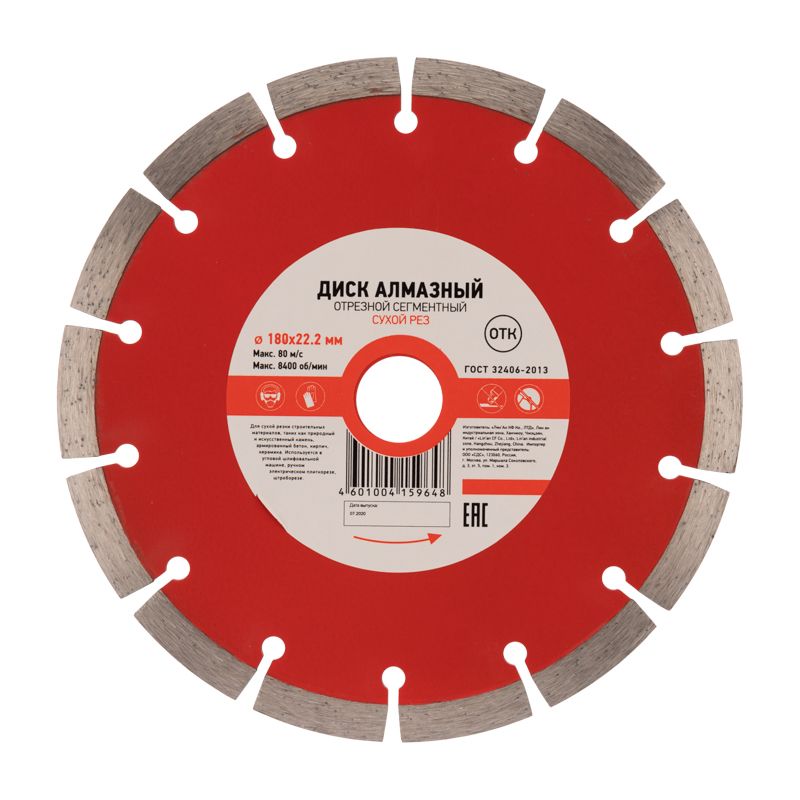Внимание. Запрещается использовать диск для разрезания металлов. При установке диска руководствуйтесь стрелкой направления вращения диска. Используйте средства индивидуальной защиты. Не утилизировать с бытовыми отходами.