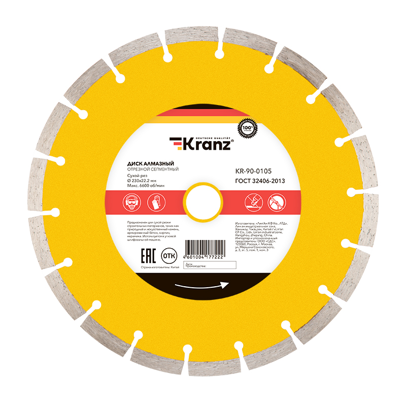 Диск алмазный отрезной сегментный 230x22.2 мм KRANZ предназначен для сухой резки строительных материалов, таких как природный и искусственный камень, армированный бетон, кирпич, керамика. Используется в угловой шлифовальной машине, ручном электрическом плиткорезе, штроборезе.