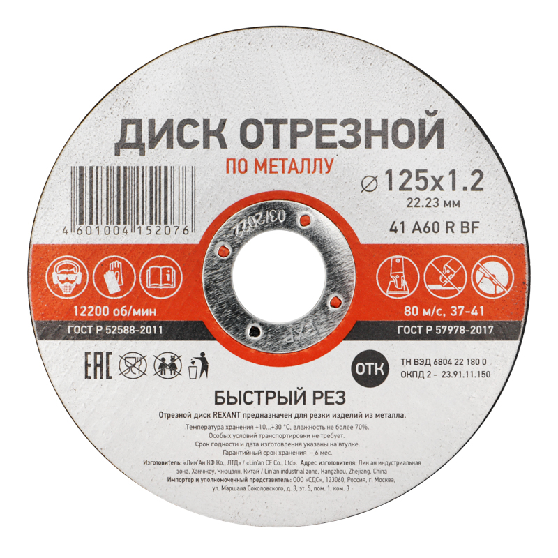 Подходит к большинству УШМ, имеющих стандартное посадочное отверстие (22,23 мм), во время установки необходимо руководствоваться стрелкой направления вращения диска. Изготовлен на бакелитовой основе (BF) с двумя слоями армированной стеклосетки, на которую нанесен шлифматериал (абразивное зерно из электрокерамического корунда (А) и современных вяжущих материалов). Отрезной круг отличается большими ресурсными показателями, точностью реза, высокой производительностью и низким уровнем шума. Диск использовать строго по назначению, а также соблюдать технику безопасности и использовать средства индивидуальной защиты.