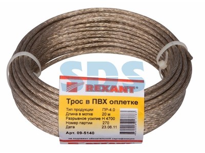 Стальной трос с полимерным покрытием, свивается из высокоуглеродистой стальной проволоки (латунированной с высоким содержанием углерода) и покрывается ПВХ, выдерживая перепады температуры –60...+110 °С