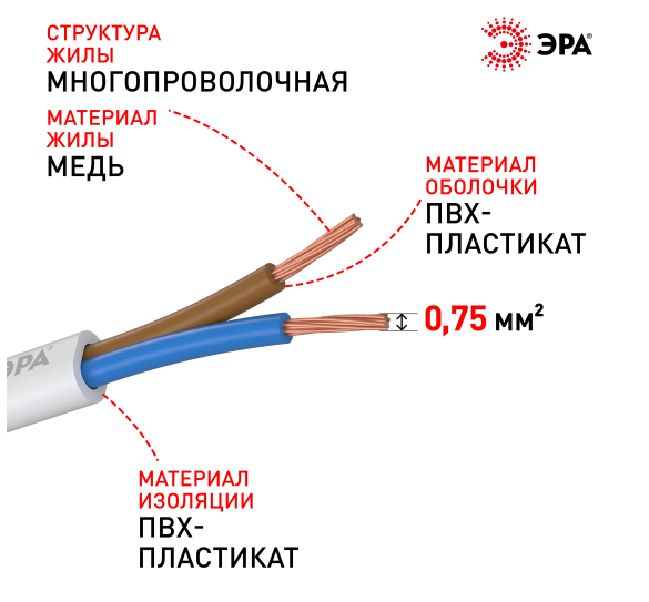 Провод ШВВП 2х0,75 ГОСТ 7399-97 белый ЭРА (100)