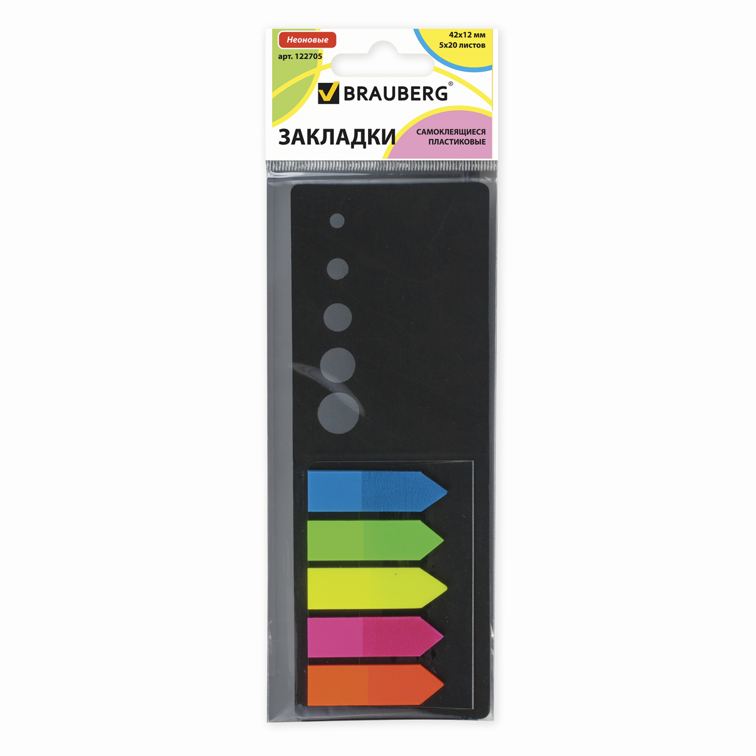 Закладки Brauberg НЕОНОВЫЕ клейкие пластиковые 42*12мм 5 цветов по 20 листов в картонной книжке