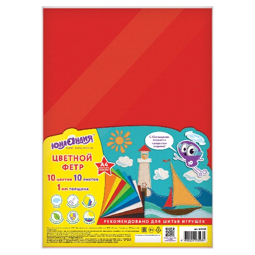 Цветной фетр для творчества А4 10л 10 цветов Юнландия 10 ЯРКИХ ЦВЕТОВ толщина 1 мм с европодвесом (1/5)