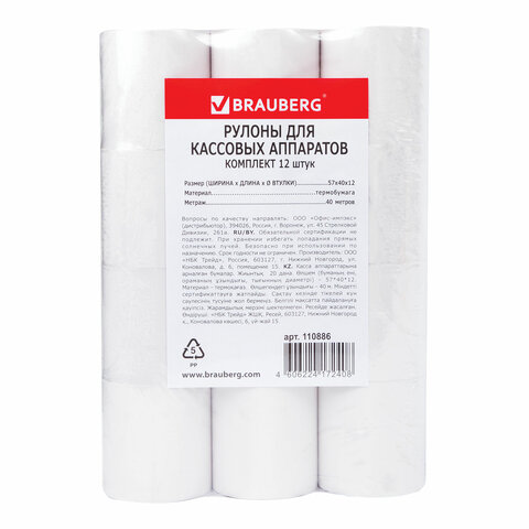 Чековая лента термо 57мм 40м Brauberg 57*12*40 комплект 12 рулонов (1/11)