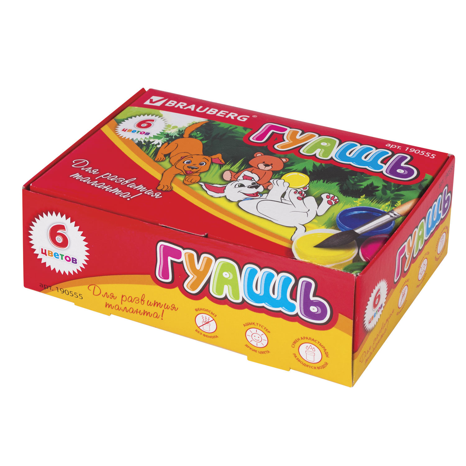 Гуашь 6 цветов Brauberg по 20 мл без кисти картонная упаковка (6/36)