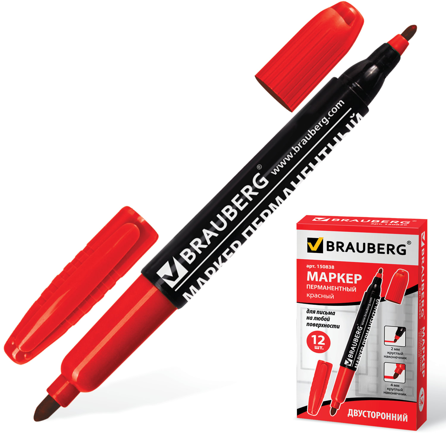 Маркер BRAUBERG перманентный (нестираемый) двусторонний наконечник круглый 2-4мм красный (12)