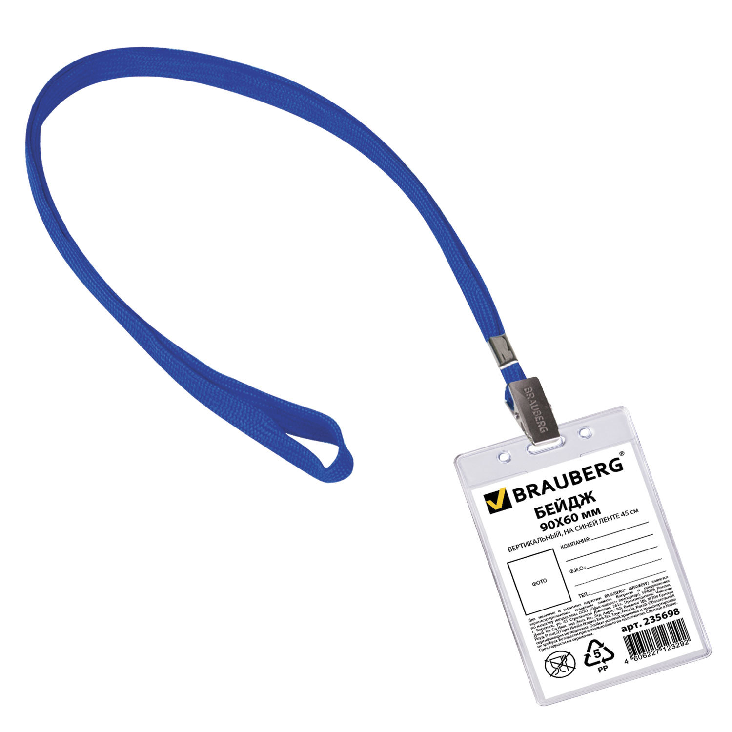 Бейдж-карман Brauberg вертикальный 90*60мм на синей ленте 45см (10/20)