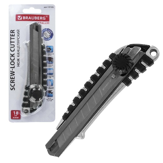 Нож канцелярский лезвие 18мм Brauberg "Metallic" роликовый фиксатор резиновые вставки металл (3/12)