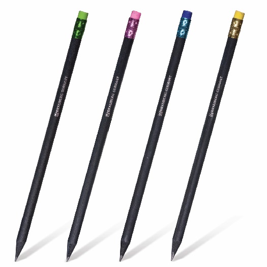 Изготовлен из черного дерева высокого качества, оснащен ластиком ярких цветов ассорти. Имеет круглое сечение. Карандаш длиной 190 мм легко точится и не крошится. Обладает средней степенью твердости – HB. Выполнен в черном цвете. Поставляется заточенным.