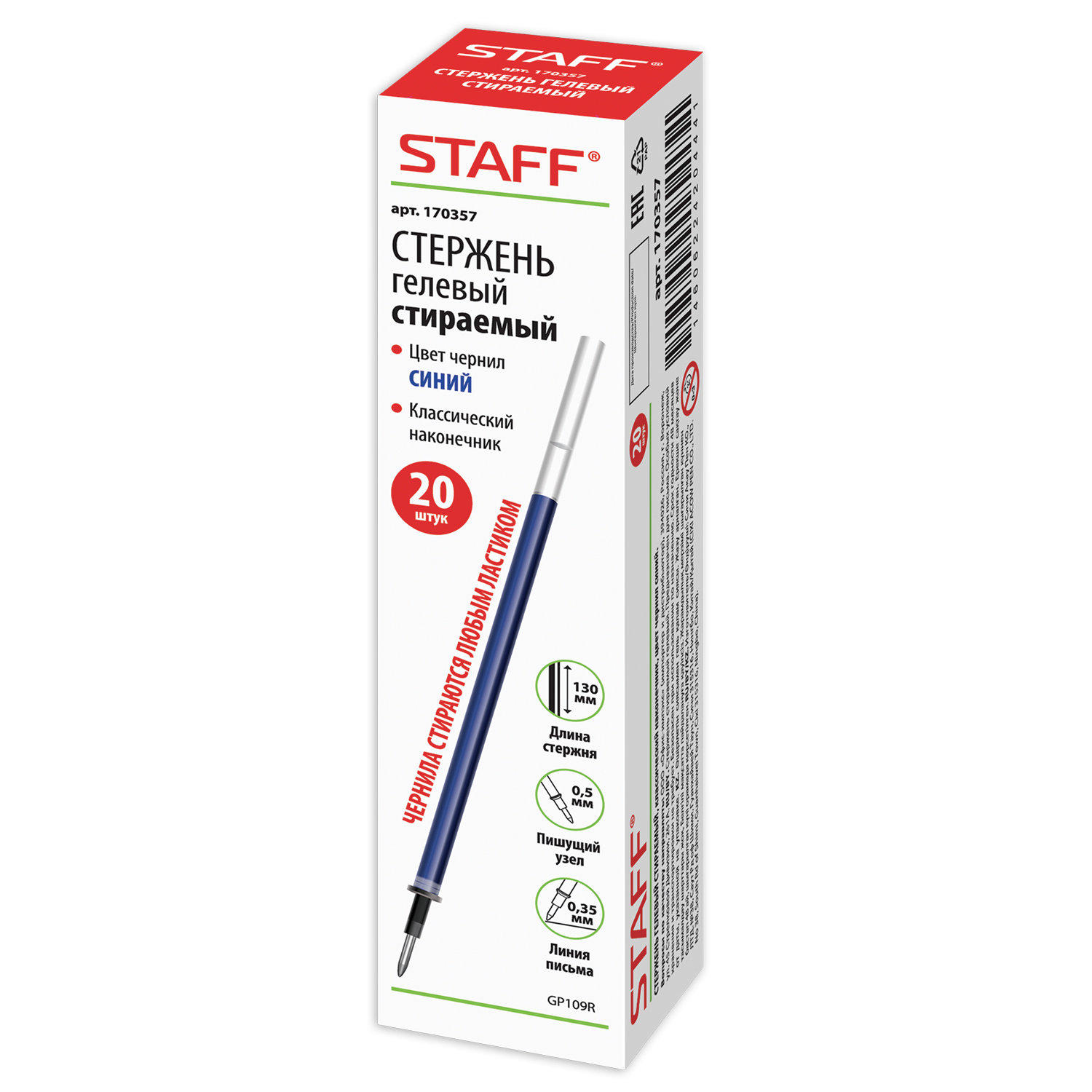 Интернет-магазин «Витрина 59» предлагает купить товар «Стержень стираемый гелевый Staff 130мм узел 0,5мм линия 0,35мм синий (20)» по цене: 500.00 руб. за 20 шт Артикул товара - 170357. Вы можете оформить заказ через интернет-магазин или по телефону +7 (950) 45-67-67-6. Дополнительную информацию о продаже товаров из каталога «Канцтовары» вы можете получить у нашего менеджера. Звоните!