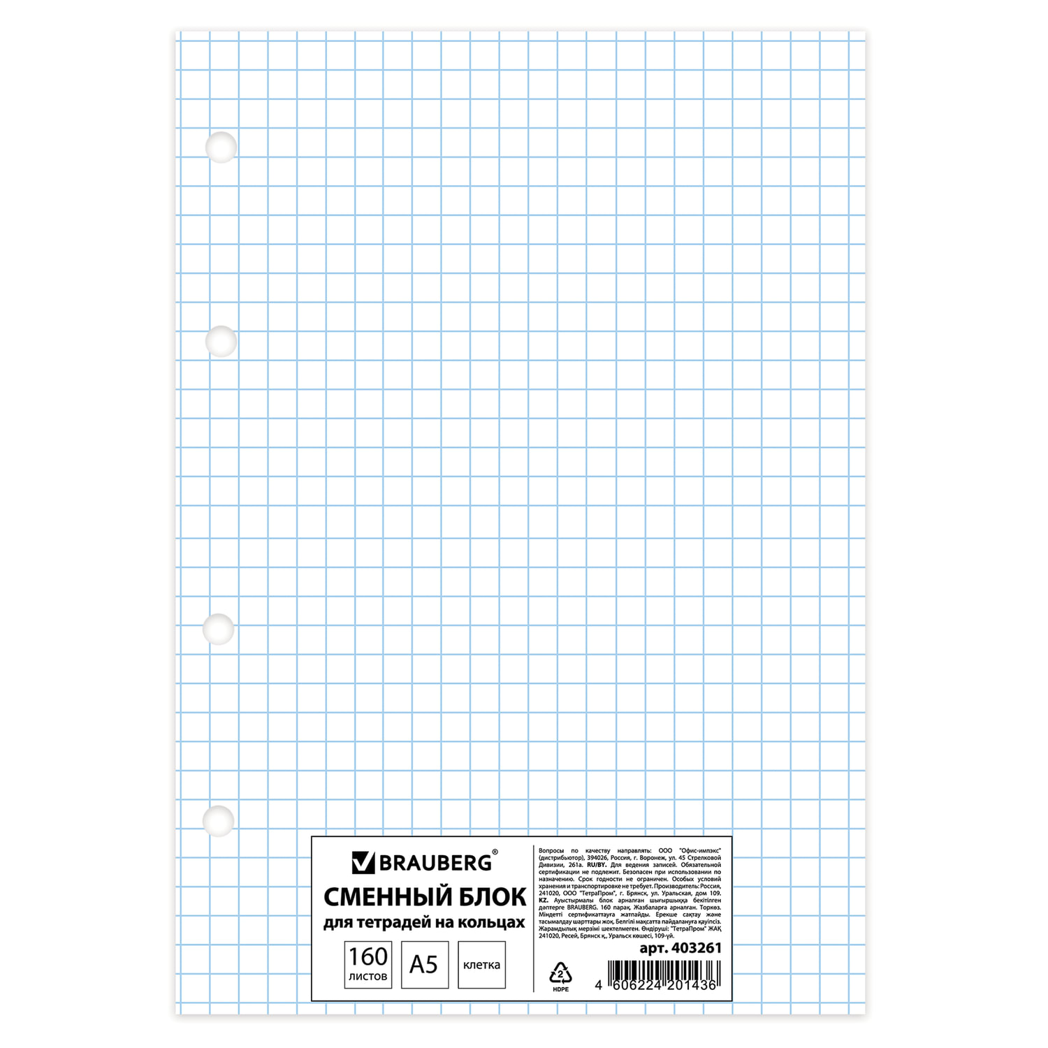 Сменный блок к тетради на кольцах А5 BRAUBERG ЭКО "Белый" 160 л. (1/20)