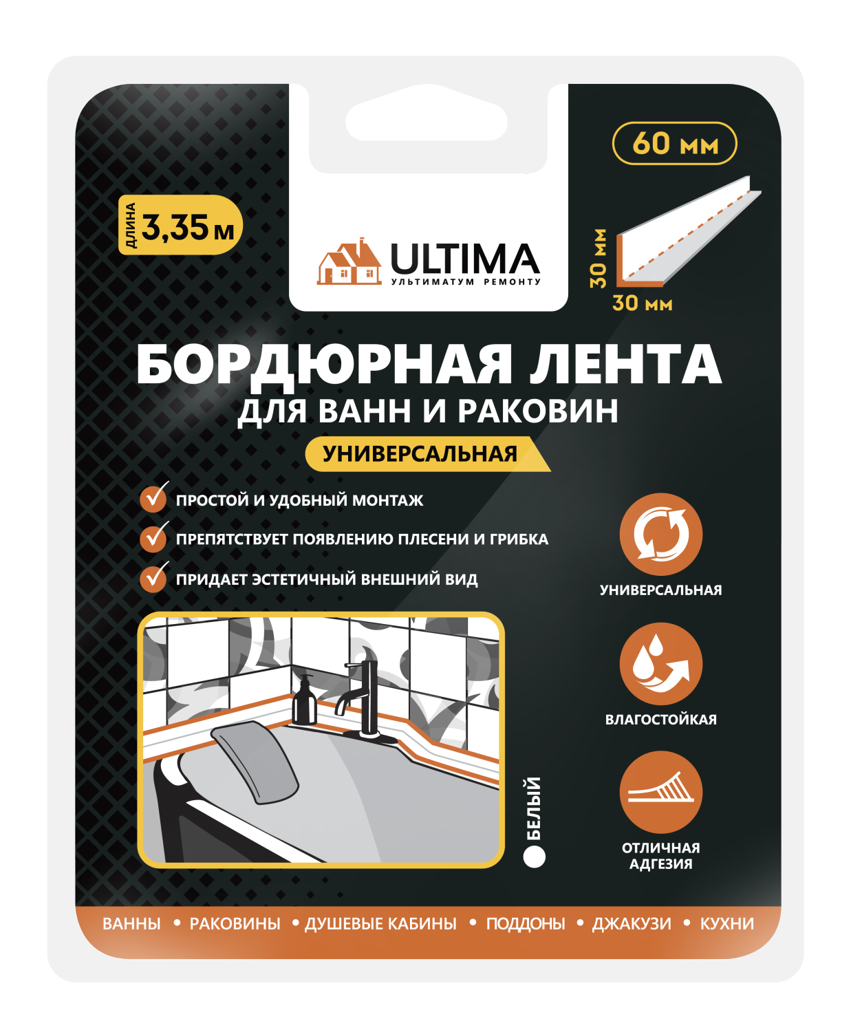 Бордюрная лента д/ванны 60мм х 3,2м Ultima белый (20)