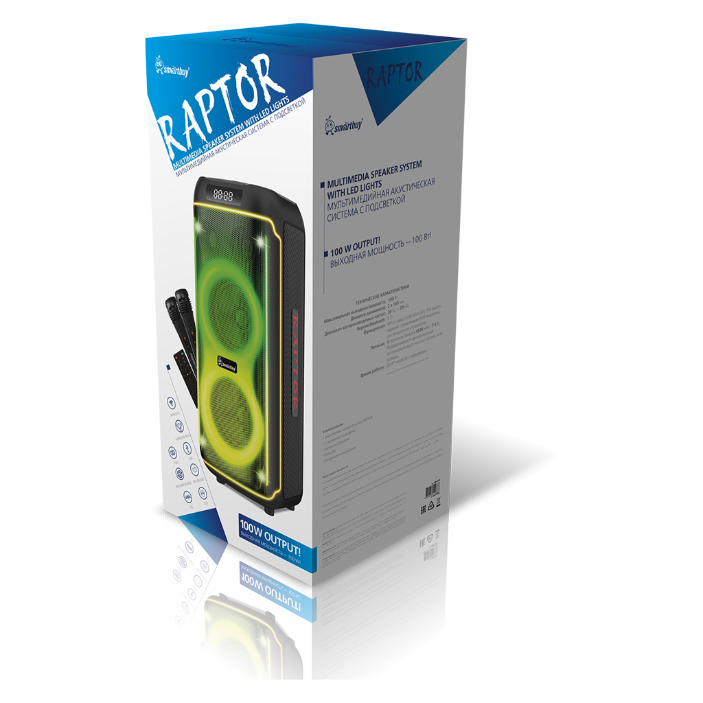 Колонка портативная Bluetooth SmartBuy 5760 RAPTOR, 100Вт, аккумулятор 4500мАч, FM/MP3(microSD/USB)/AUX/TWS/2 микрофона/ПДУ/управляемая RGB-подсветка, чёрный (1)