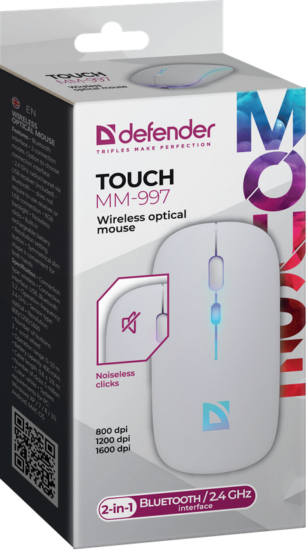 Мышь Defender бесшумная Touch MM-997, 4кн, 800/1200/1600 dpi, 2 режима подключения (BT + радиоканал 2.4 ГГц), RGB-подсветка, АКБ, белый, беспроводная (1/100)