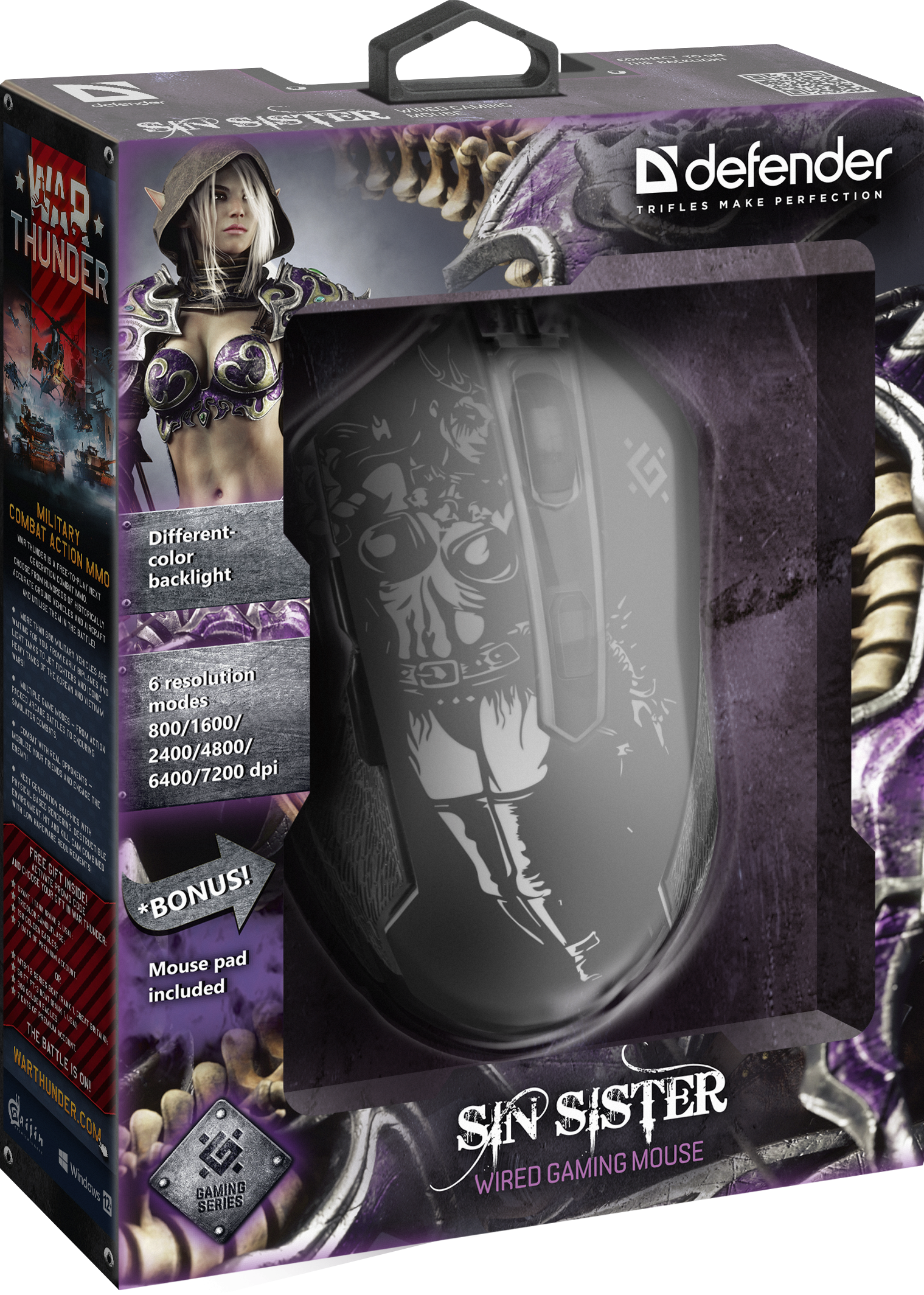Мышь игровая Defender Sin'Sister GM-933 6кн, 800/1600/2400/4800/6400/7200dpi, радужная подсветка, коврик 220*180*3мм в комплекте, чёрный (1/40)