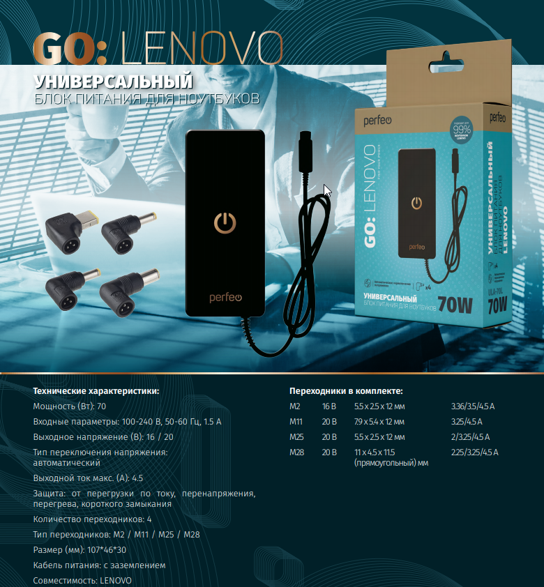 Блок питания универсальный для ноутбуков Perfeo LENOVO 220В/70Вт, с автоматическим определением напряжения (ULA-70L)