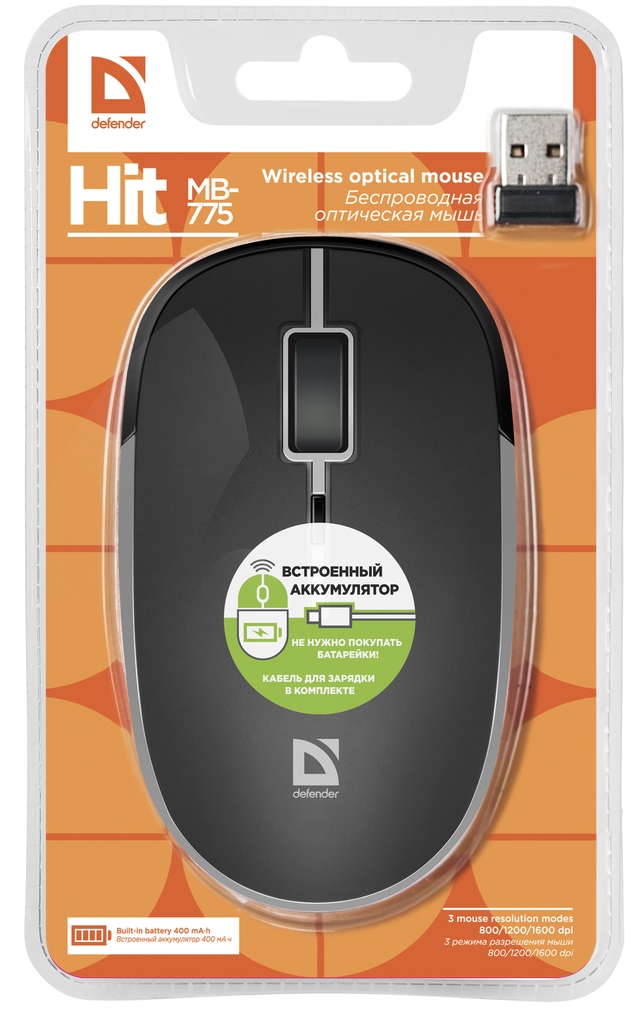 Мышь Defender Hit MB-775 4кн, зарядка от USB, встроенный аккумулятор, 800/1200/1600 dpi, черный, беспроводная (1/40)