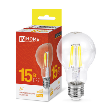 Лампа филамент A60 15Вт Е27 3000К 1480Лм прозрачная InHome (10)