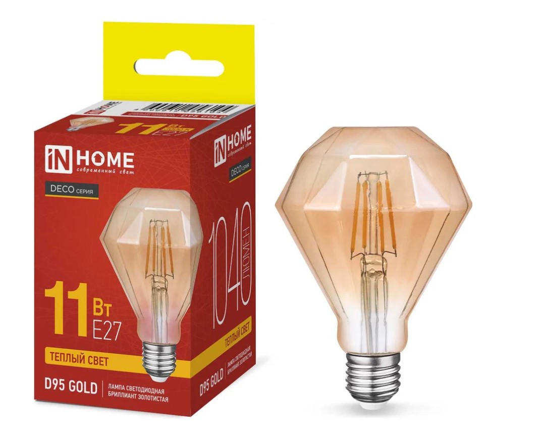 Лампа филамент D95 gold 11Вт E27 3000K 1040Лм бриллиант золотистая InHome