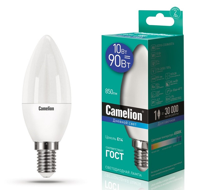 Лампа диодная свеча 10Вт Е14 6500К 850Лм Camelion (10/100)