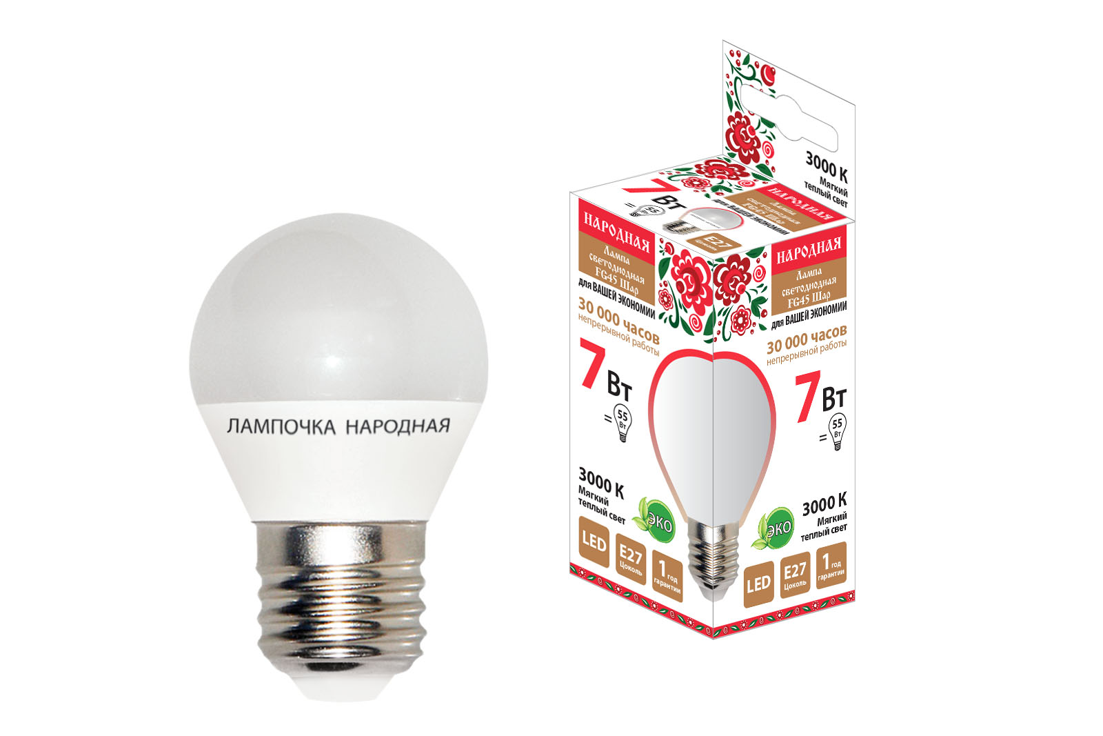 Лампа диодная шар G45 7Вт Е27 3000К 560Лм TDM Народная (10/100)